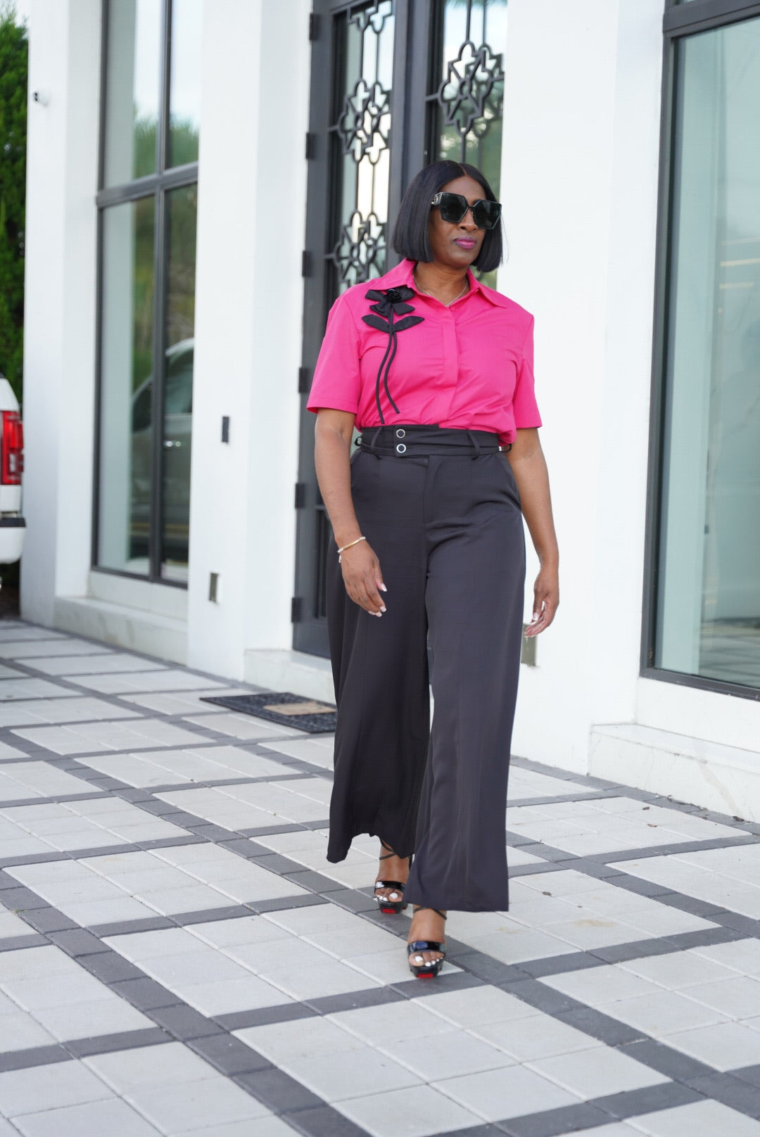 Vibrant fuchsia button-up with a statement black flower embellishment at the shoulder; clean, classic finish.