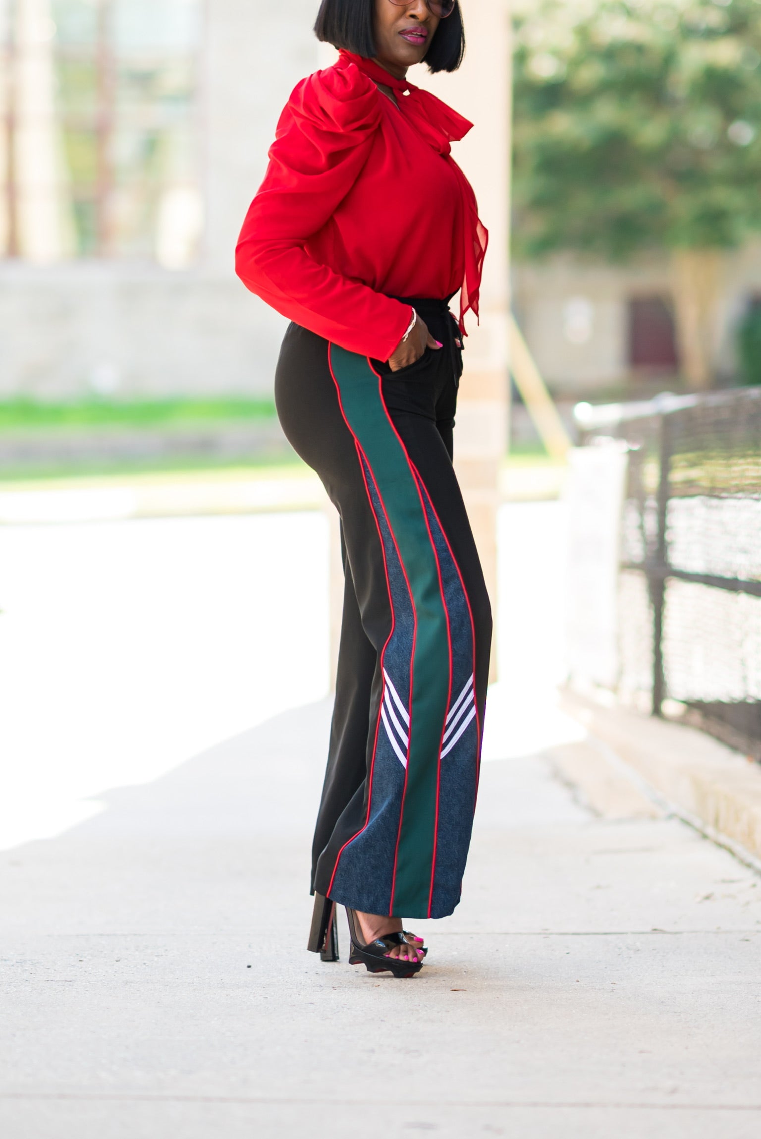 Black Wide-leg pants with denim contrast detailing and piping. Designed to flatter and pair with the Heritage Jacket.