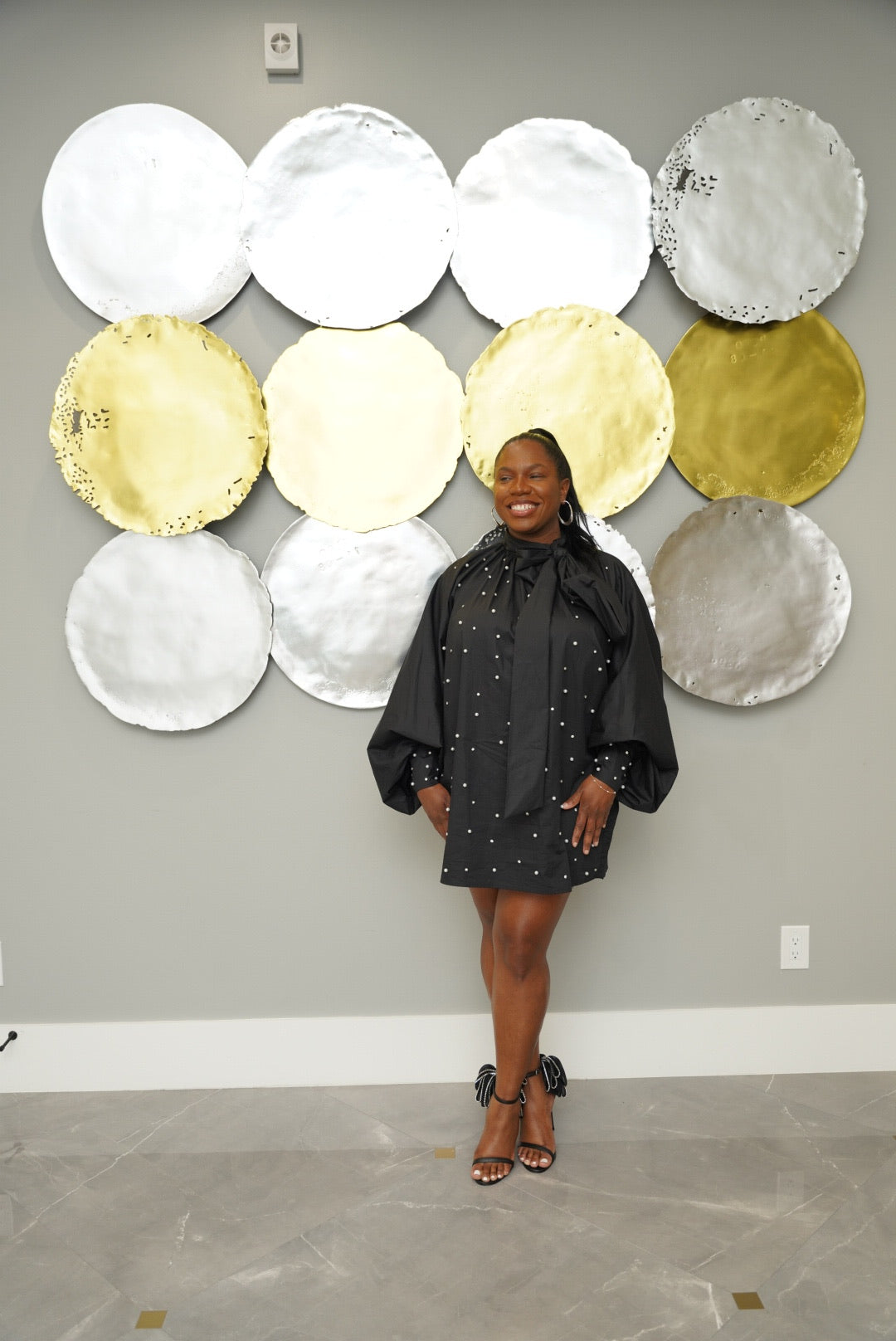 Oversized black top with front rhinestone embellishment, wide cuffed sleeves, and a dramatic side-tie neckline bow.