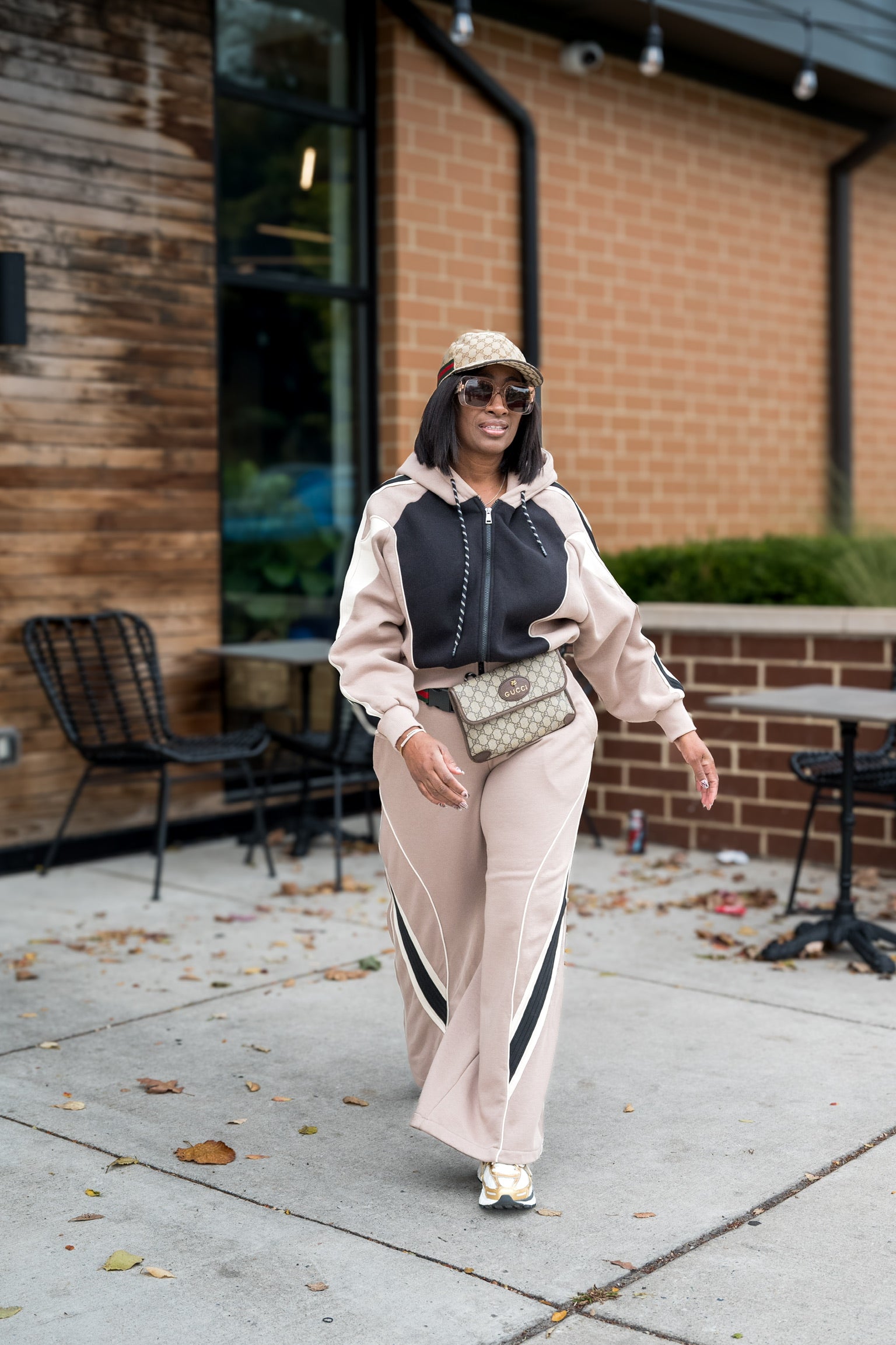 Wide-leg beige and black hooded sweatsuit with abstract piping detail. Soft, luxe comfort meets street style.