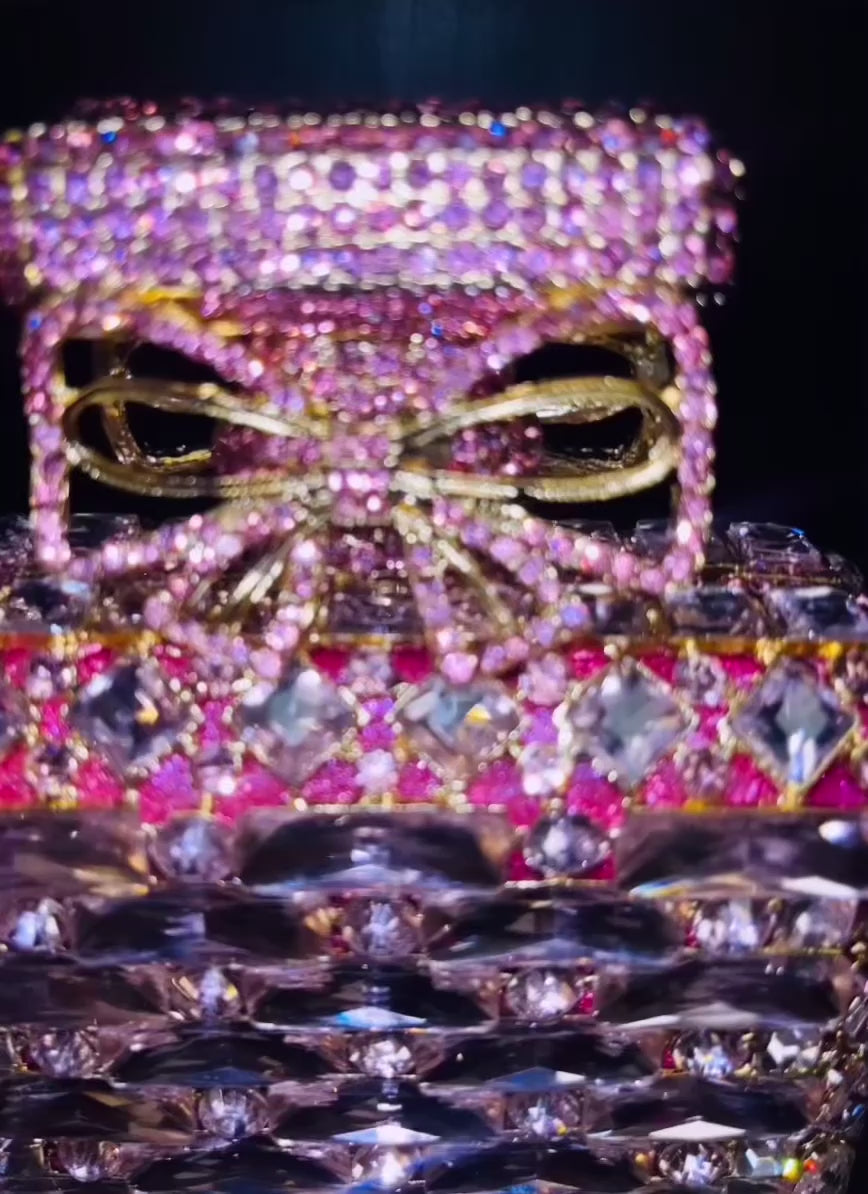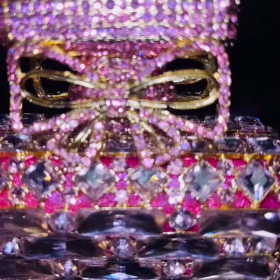 Embrace luxury with our stunning Pink Stone Perfume Bottle Purse. Adorned with high quality pink stones, gold hardware, and Swartz crystals, this unique bag adds glamour to any outfit. The inside features soft gold leather and a detachable chain strap. A perfect accessory for any occasion.