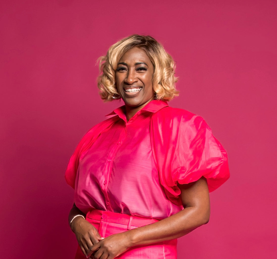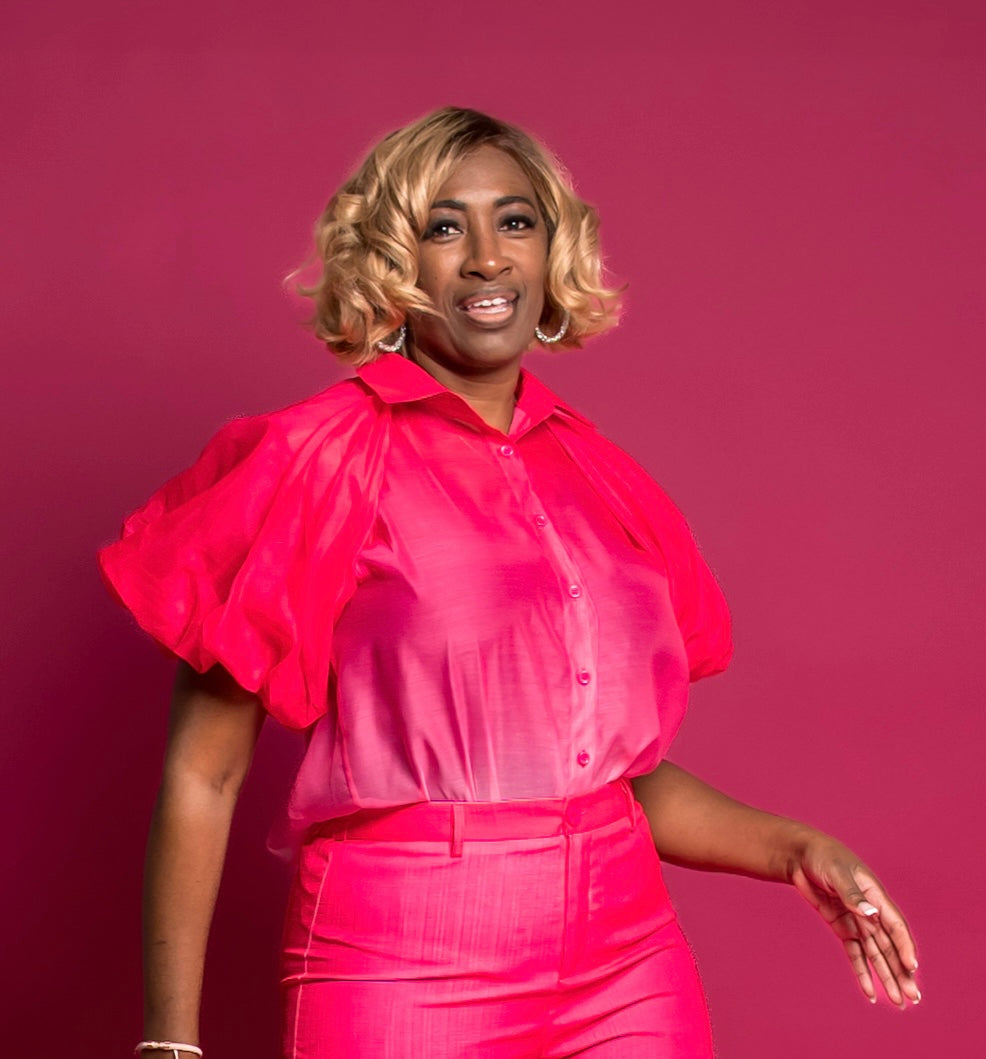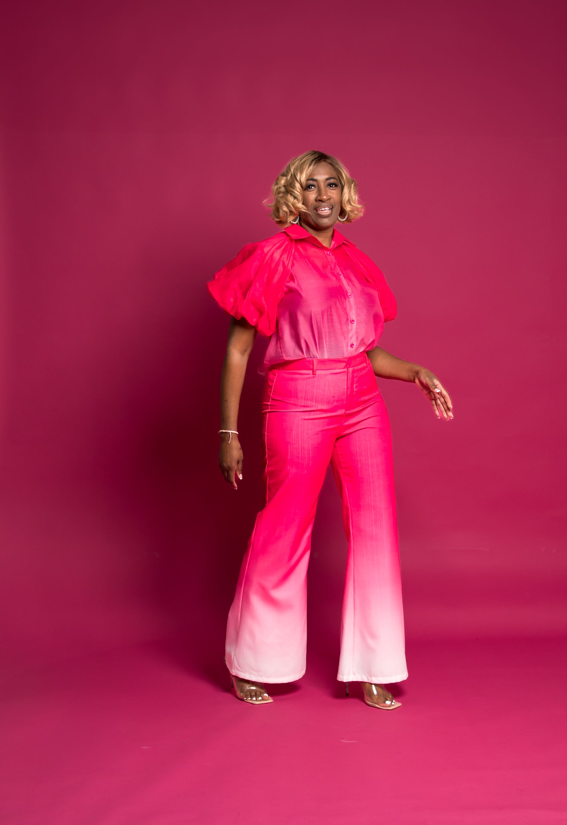 Romantic ombre blouse fading from blush pink to soft white with ruffled sleeves and button-up front.