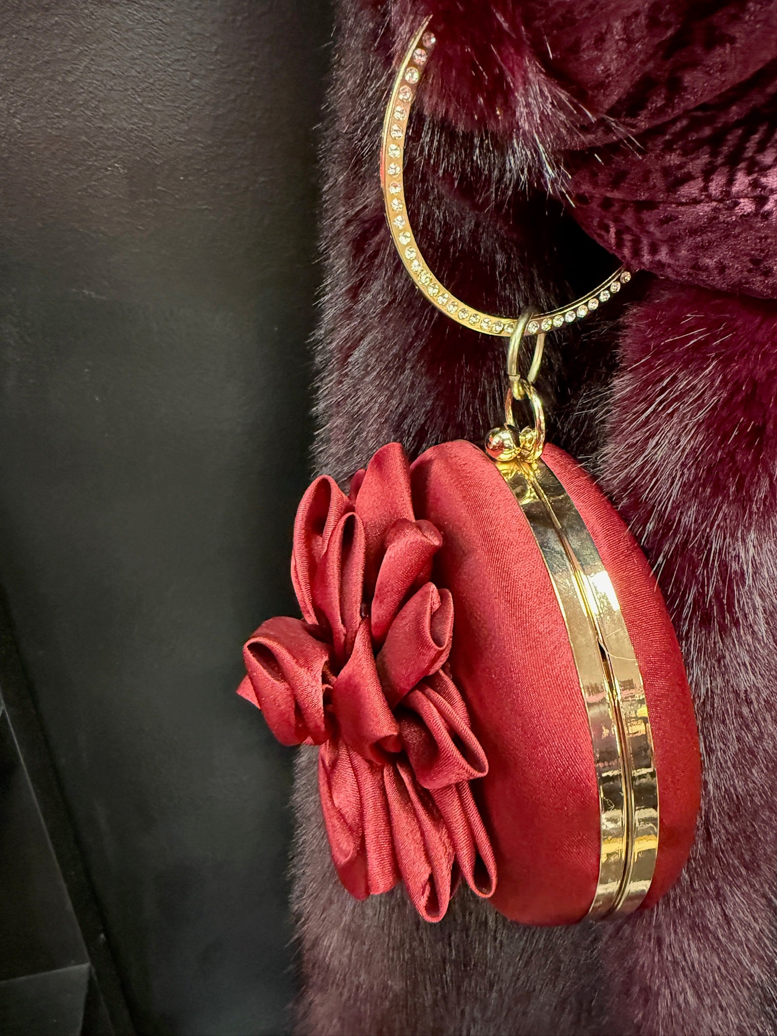 Add elegance and charm to any outfit with our Satin Floral Clutch! Featuring a beautiful satin flower with a sparkling rhinestone center, accented with gold trim and a convenient wristlet handle. Use as a clutch or attach the detachable gold chain strap for a versatile and stylish look. Small and dainty, perfect for any occasion.