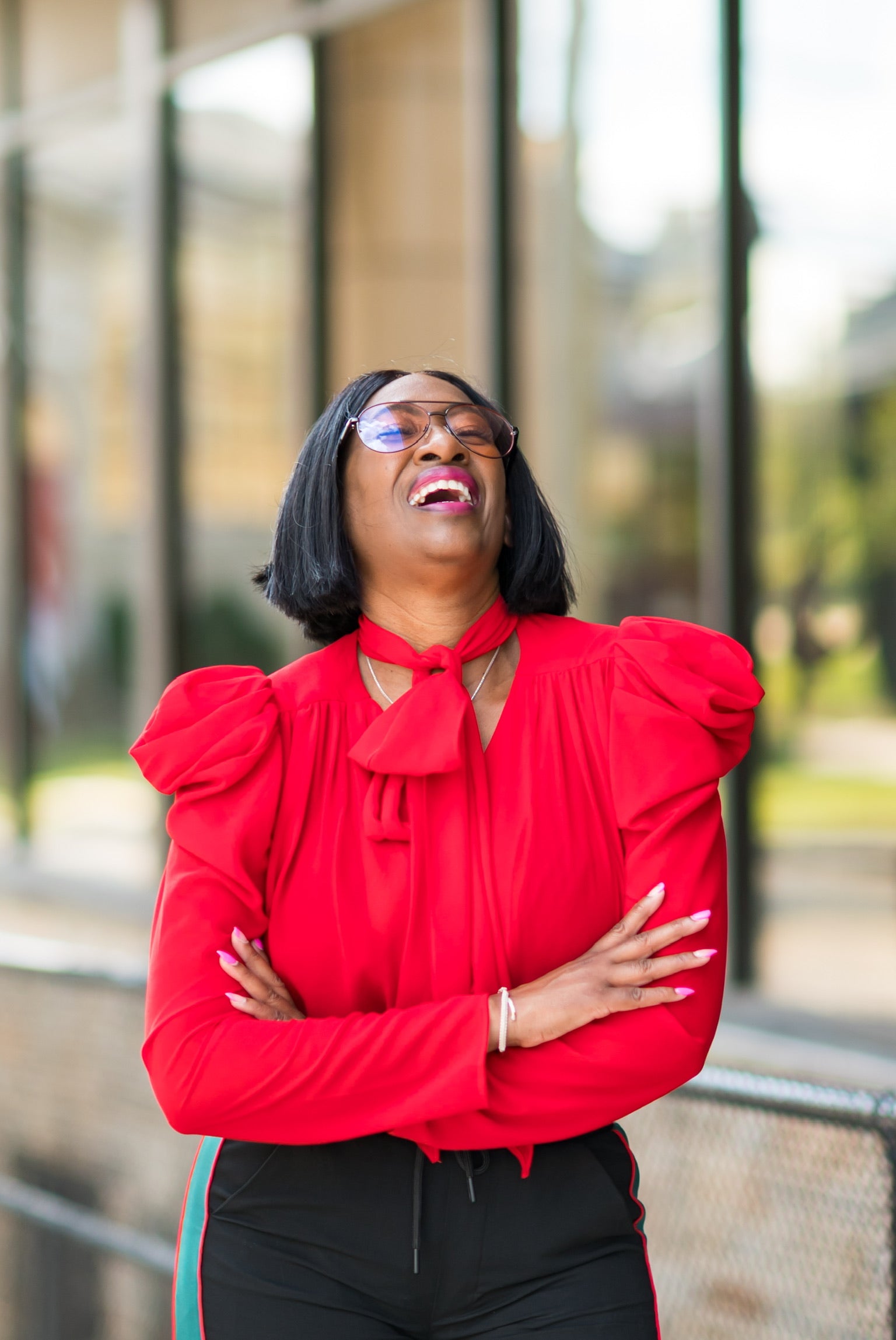 Bold red blouse with exaggerated sleeves and a dramatic bow-tie neckline; sheer yet elegant.