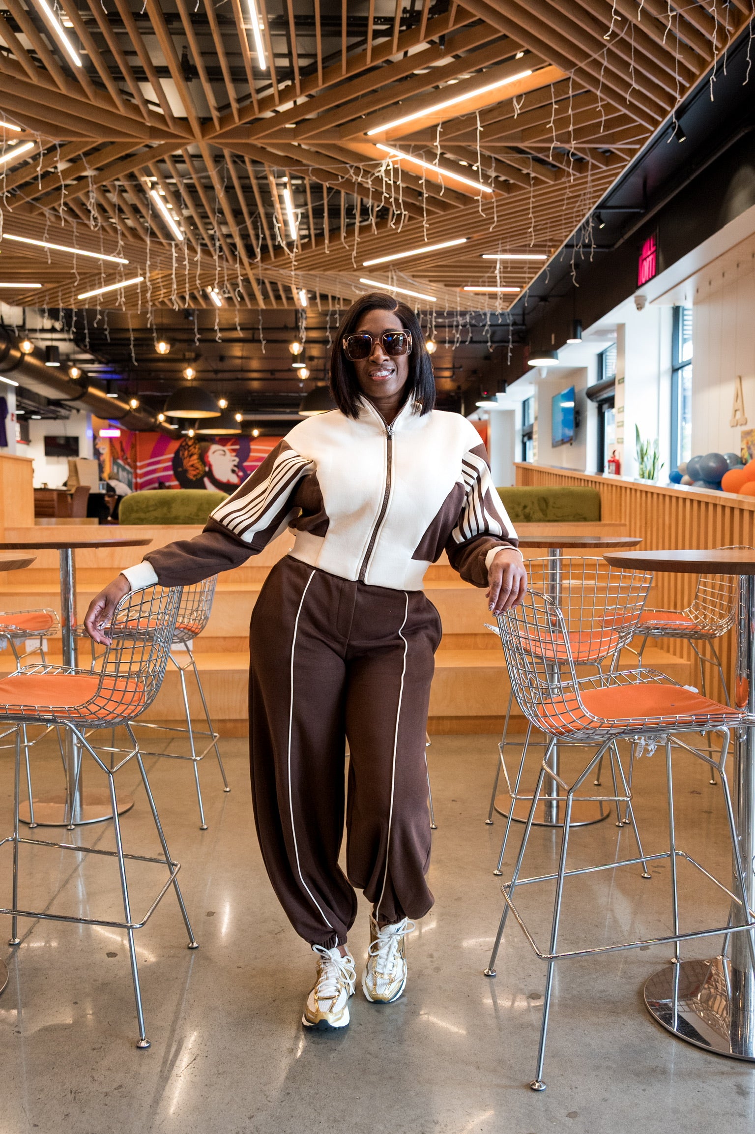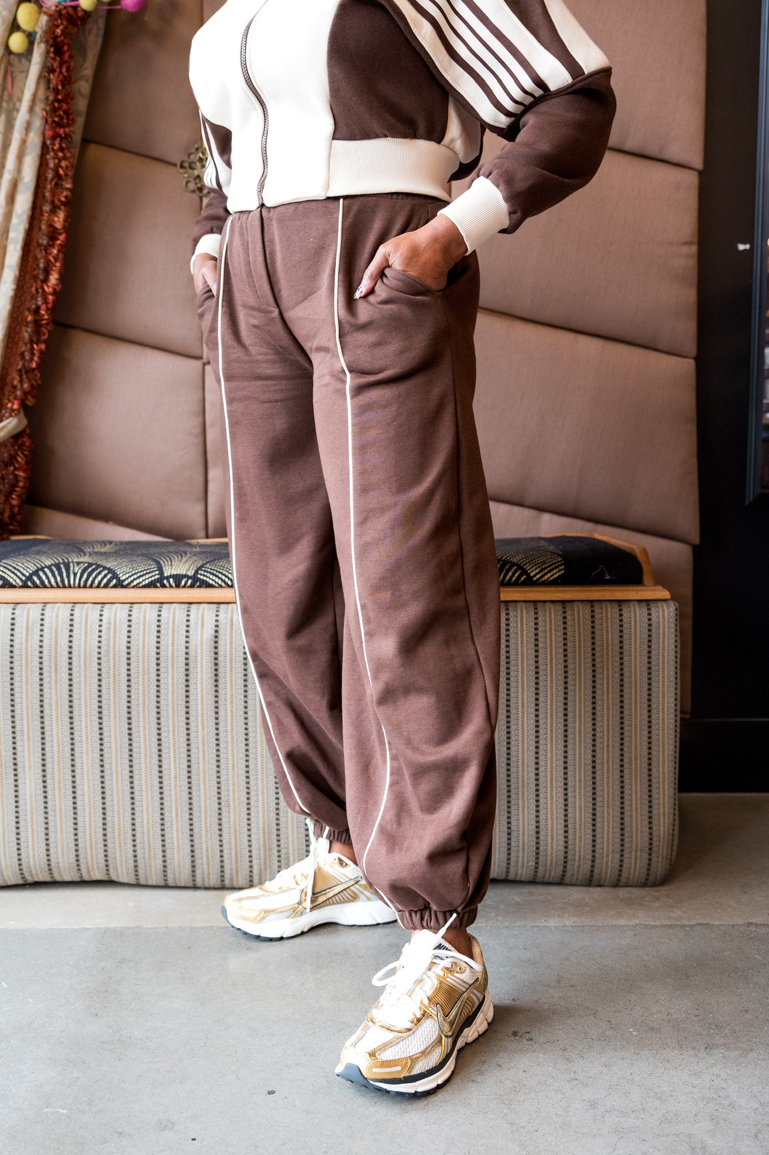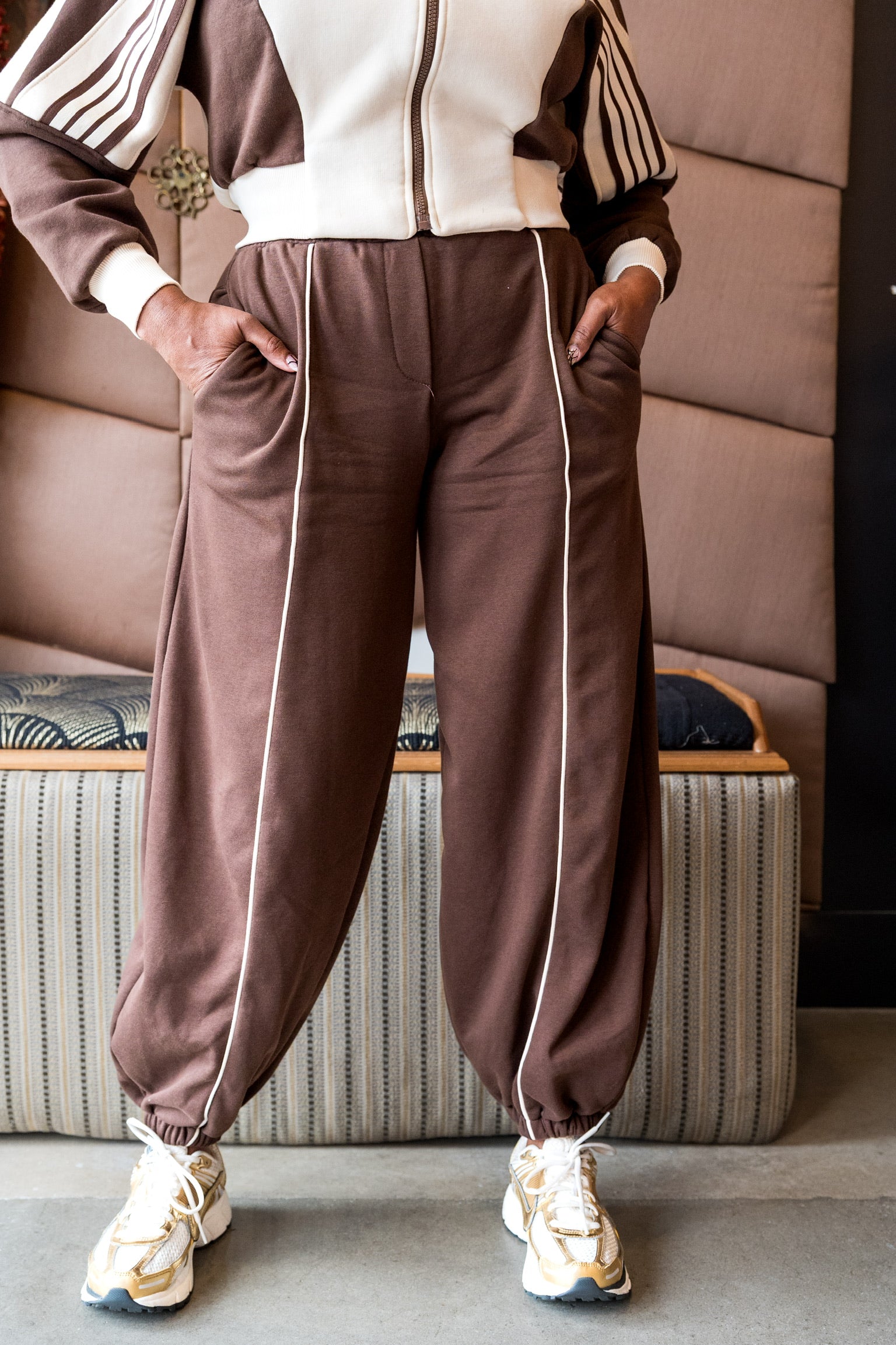 Brown track set with white piping and elastic ankle. Luxe comfort meets sporty chic.
