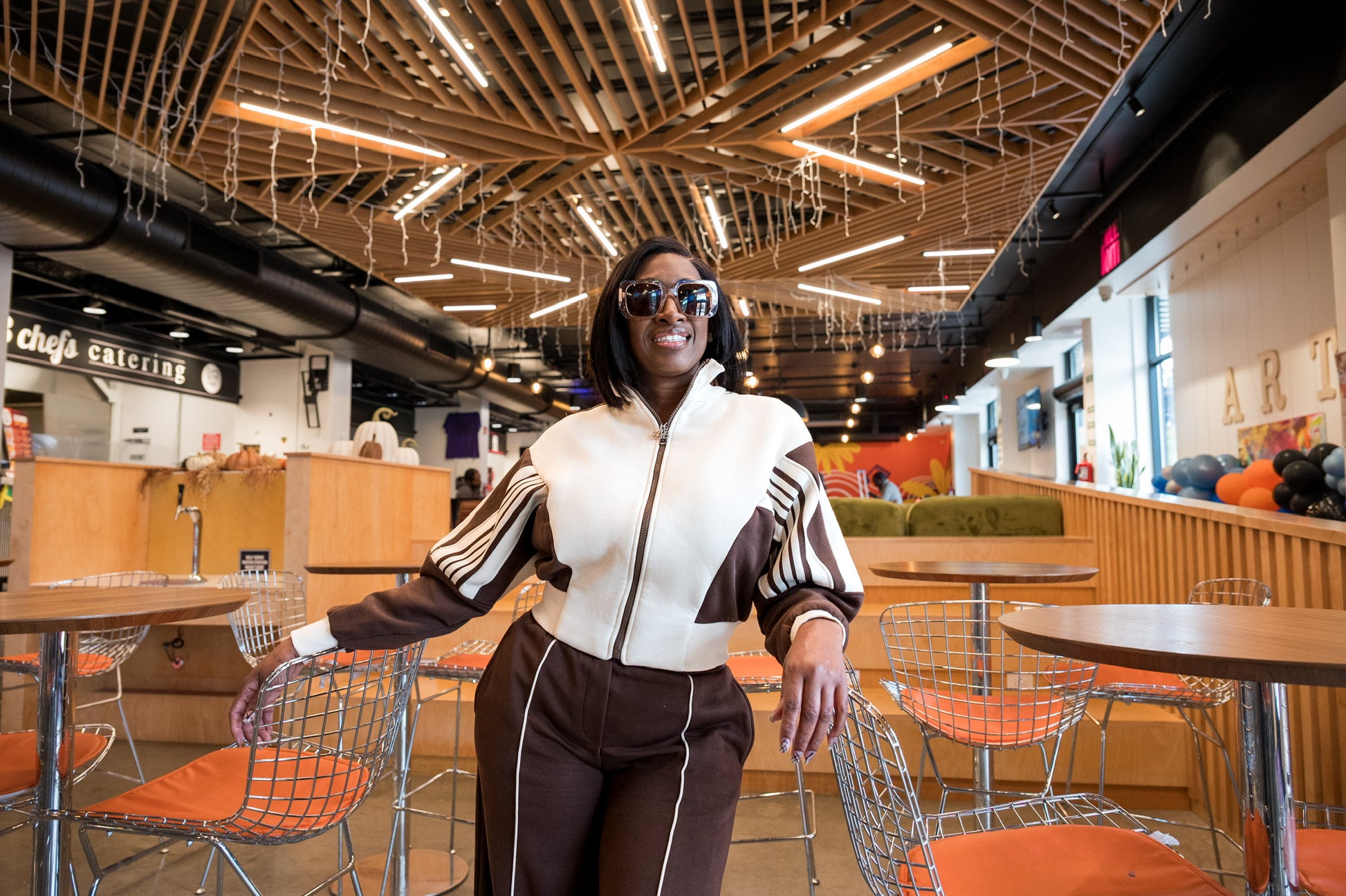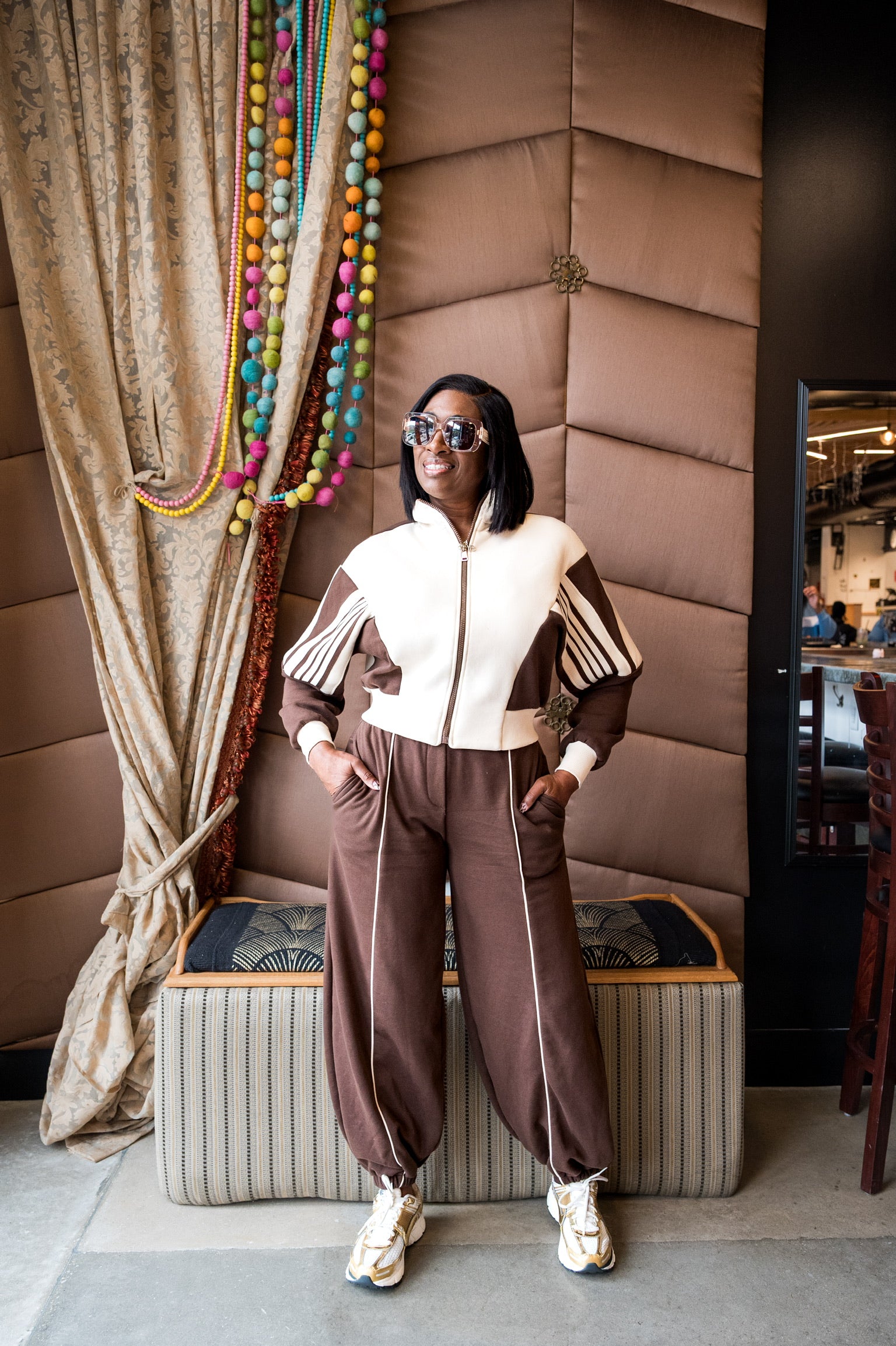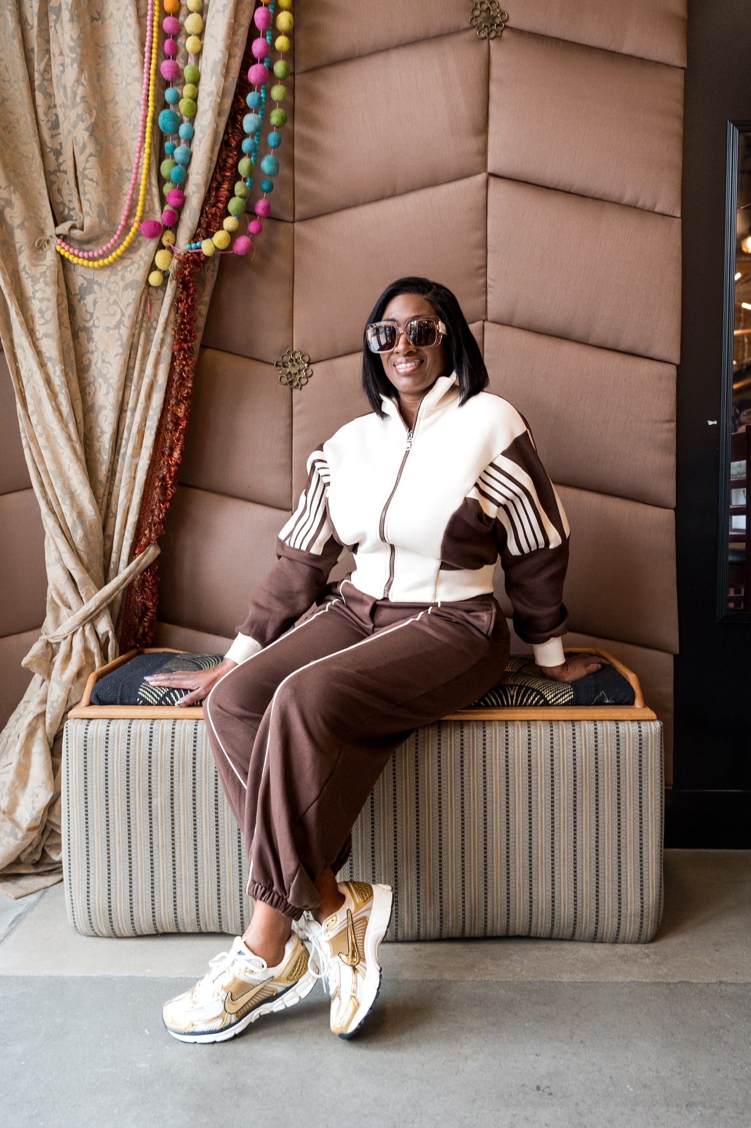 Brown track set with white piping and elastic ankle. Luxe comfort meets sporty chic.